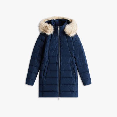 Este abrigo acolchado con corte slim, relleno de plumón y acabado de pelo sintético extraíble combina un acabado repelente al agua con un elegante diseño.