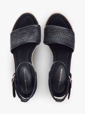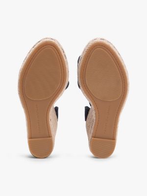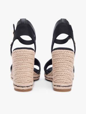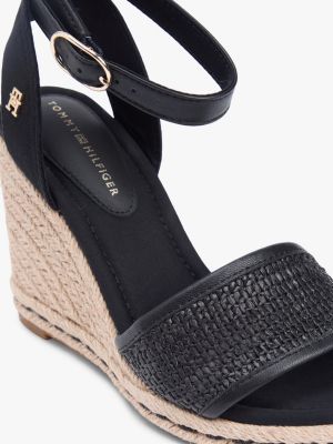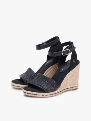 Estas alpargatas con cuña alta y una tira en el tobillo presentan una mezcla de acabados de rafia y yute que les aportan textura.