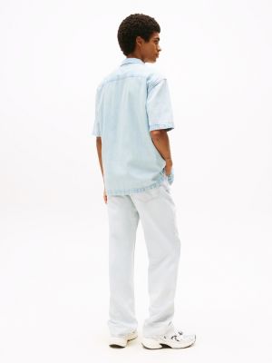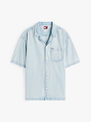 Esta camisa amplia, de manga corta y con cuello cubano, está confeccionada en tejido denim ligero y resulta ideal para looks informales de verano.