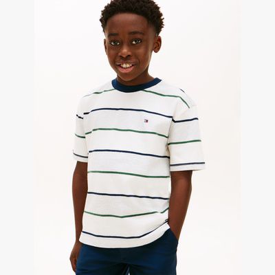 Esta camiseta, confeccionada en punto de puro algodón con acabado aterciopelado, luce llamativas rayas estilo rugby que realzan su estilo deportivo clásico.