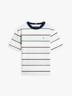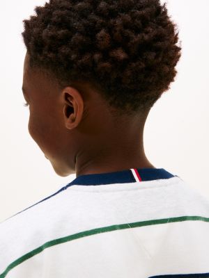 Esta camiseta, confeccionada en punto de puro algodón con acabado aterciopelado, luce llamativas rayas estilo rugby que realzan su estilo deportivo clásico.