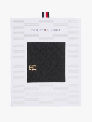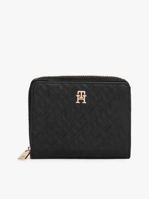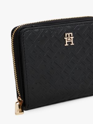 Esta cartera con cremallera perimetral luce un diseño integral del monograma TH en relieve y una insignia con el mismo motivo.