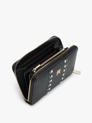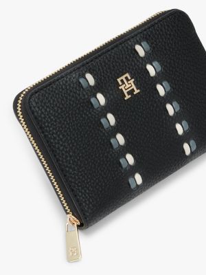 Esta elegante cartera con textura granulada luce una insignia del monograma TH y una cinta distintiva tonal que le aporta un toque deportivo.