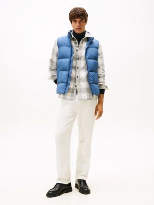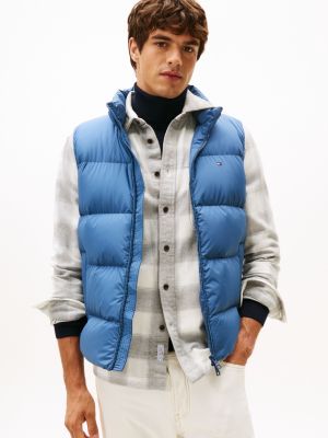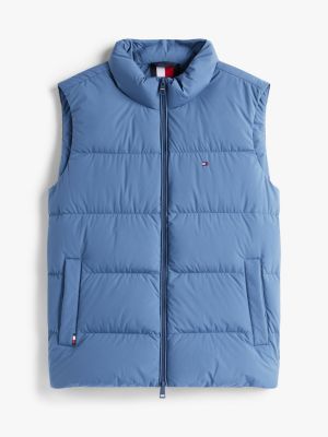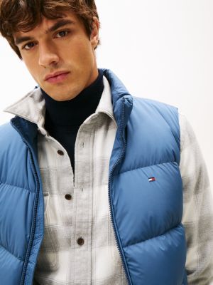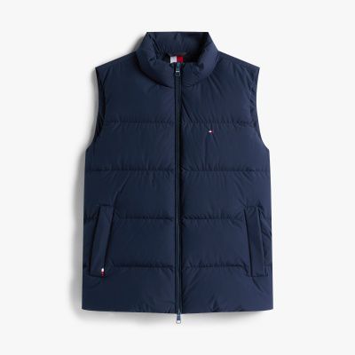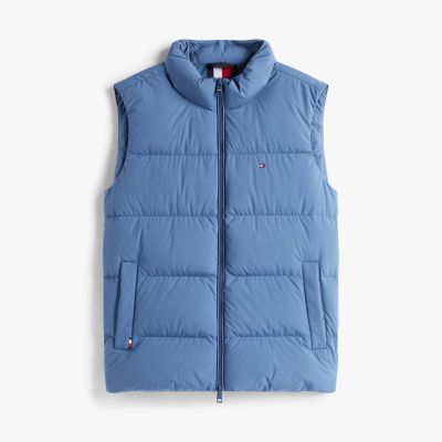 Este chaleco acolchado, con relleno de plumón, cuello levantado y acabado repelente al agua, es ideal para abrigarse en los días lluviosos y se completa con un logo bordado.