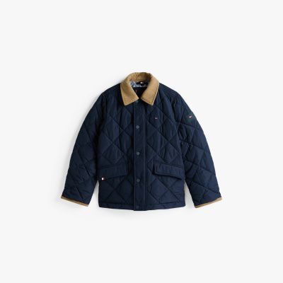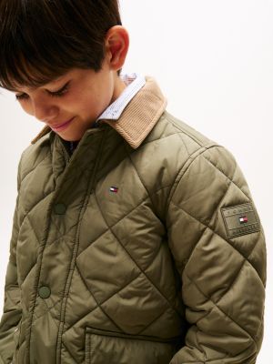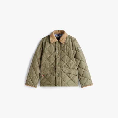 Esta chaqueta acolchada, ideal para entretiempo, se caracteriza por el cuello de pana a contraste, las prácticos bolsillos con solapa y el diseño de pespuntes en forma de rombos.
