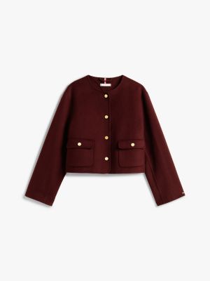 Esta chaqueta, una prenda versátil para el entretiempo, está confeccionada en mezcla de lana de doble cara y presenta un diseño moderno.