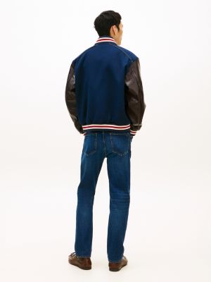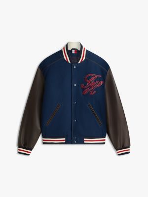 Esta chaqueta universitaria de piel luce las mangas a contraste, un interior acolchado con motivo de rombos y un logo oversize en el pecho.