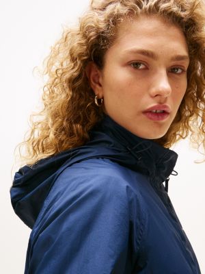 Este cortavientos, tan ligero como práctico, cuenta con un acabado que repele el agua y una capucha plegable con cordón.