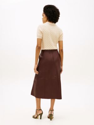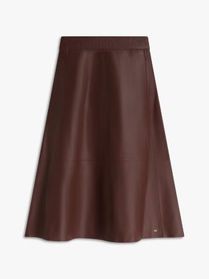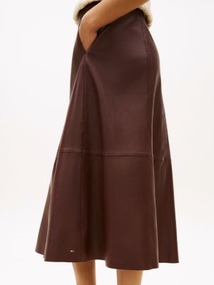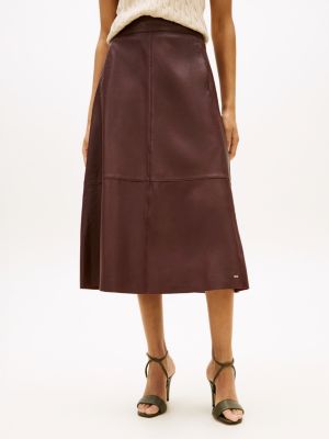 Aporta un toque suntuoso a tus looks con esta falda de corte acampanado, confeccionada en piel napa con paneles y pespuntes decorativos.