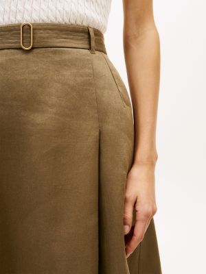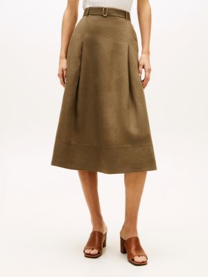 Esta falda de largo bajo la rodilla, elaborada en sarga de puro lino, presenta una silueta evasé favorecedora y un cinturón con costuras visibles de estilo militar.