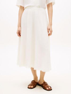 Esta falda midi plisada de corte evasé, confeccionada en mezcla de lino ligero, luce un logo metálico distintivo y es ideal para los días cálidos.