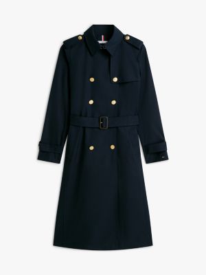 Esta moderna gabardina midi de corte slim, confeccionada en tejido que repele el agua, se completa con un cinturón con hebilla de piel y botones dorados.