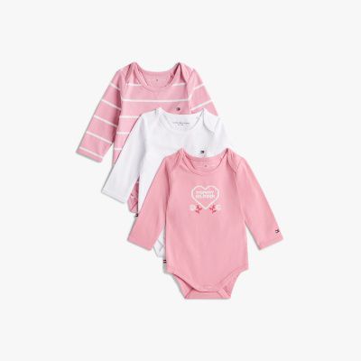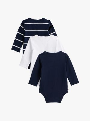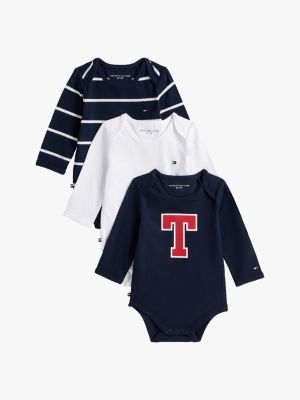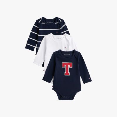 Este pack incluye tres bodis de manga larga, ideales como regalo para recién nacidos, con un diseño liso y otros dos inspirados en la estética universitaria.