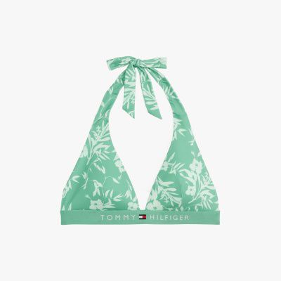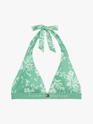 Esta parte superior de bikini con cuello halter de cordones, un diseño integral de colores vivos y un acolchado extraíble, es ideal para lograr un look retro de piscina.