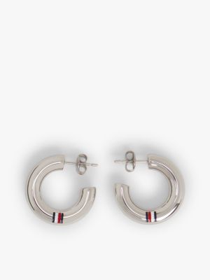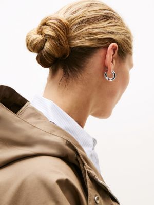 Estos elegantes pendientes de aro, elaborados en acero inoxidable, se adornan con un logo de Tommy Hilfiger en bajo relieve y detalles distintivos que aportan una sutil nota de color.