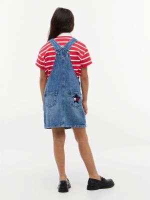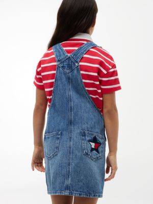 Este pichi vaquero, confeccionado en un tejido denim rígido desteñido, presenta unos tirantes ajustables, un logo de estrellas bordado en la parte trasera y un acabado lavado que le aporta un toque desenfadado.