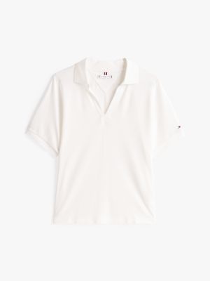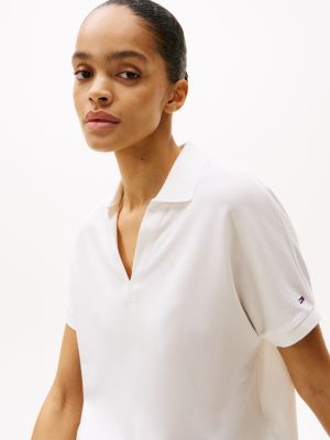 Este versátil polo de corte amplio, ideal para crear looks semiformales, se caracteriza por sus detalles distintivos y el favorecedor cuello abierto.