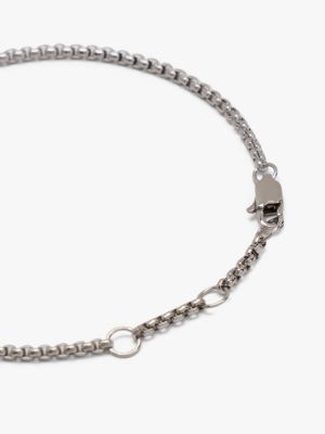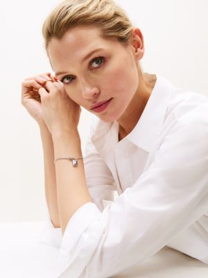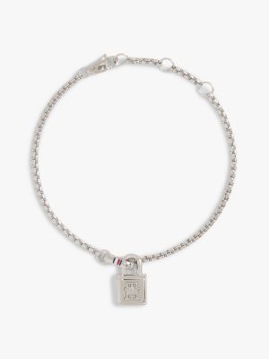 Aporta un toque sobrio y suntuoso a tus looks con esta pulsera de acero inoxidable, que presenta un intrincado diseño de eslabones y un llamativo colgante en forma de candado con un monograma TH.