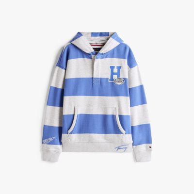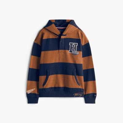 Esta sudadera con capucha presenta detalles de inspiración universitaria, como las rayas deportivas, los bordados distintivos y la tapeta de estilo polo con botones ocultos.