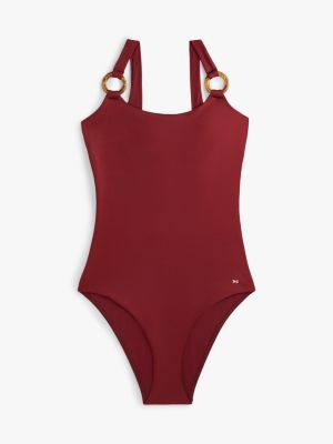 Este traje de baño clásico, ideal para la piscina, presenta una profunda abertura en la espalda e incorpora unas elegantes anillas distintivas.
