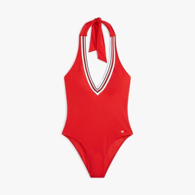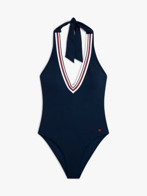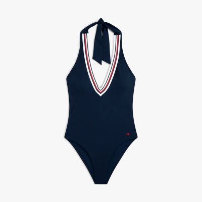 Este sofisticado traje de baño con cuello halter presenta un escote pronunciado, un ribete Global Stripe y un relleno extraíble para personalizar la forma.