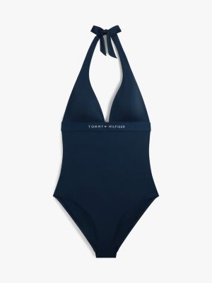 Este moderno traje de baño de cuello halter presenta copas de triángulo con relleno extraíble para conseguir un ajuste versátil.